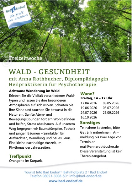 Ausgangspunkt: Kurpark / Orangerie Bad Endorf (unmittelbar neben den Chiemgau Thermen). Bei sehr starkem Regen, Gewitter oder Sturm fällt die Veranstaltung aus Sicherheitsgründen aus. Bei leichtem oder normalen Regen kann die Waldrunde stattfinden – und ist manchmal sogar besonders vitalisierend! Kontaktieren Sie mich gerne bei unbeständiger Wetterlage. Die Mitnahme von Hunden ist meist nicht sinnvoll und muss im Ausnahmefall im Vorfeld abgesprochen werden.